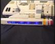 Mit eingebauter, im Orginalbausatz nicht enthaltener Beleuchtung: in jeder Warpgondel sind 4 blaue und 3 rote LED´s und im Sensoraufbau nochmals 2 blaue und 2 gelbe LED´s (mit passenden Vorwiderständen) eingebaut. Die Eingansspannung liegt bei 4,5 - 6 V. Auf dem vorletzten Bild (rio14.jpg) ist unter dem Heckfenstern in der Mitte die Mutter zu sehen, welche die 3,5 mm Klinkenbuchse für die Stromversorgung im Rumpf hält. Die Kabel (Flachband) verlassen den Rumpf rechts und links dort wieder wo die Träger der Warpgondeln am Rumpf befestigt sind. In den Trägern sind an der Klebefläche einfach Löcher gebohrt, durch die die Kabel in die Warpgondeln gelangen. Auf der Oberseite eines Trägers wurde noch ein Loch gebohrt um die Flachbandleitung durch die Halterung des Sensoraufbaus nach oben zu bringen. Der Platz im Aufbauträger ist gerade so für die Flachbandleitung ausreichend. Es ist empfehlenswert die Teile, in die LED´s eingeklebt werden, vorher auf der Innenseite schwarz zu bemalen um ein durchscheinen des Lichtes durch das Plastik im Bereich um die LED zu vermeiden. Das glit natürlich nicht für die Klarsichtteile. Dort wurde von der Innenseite mit Klarlack in rot bzw. blau bemalt. Dieses sollte mehrfach geschehen um eine ausreichende Farbdicke zu bekommen.
